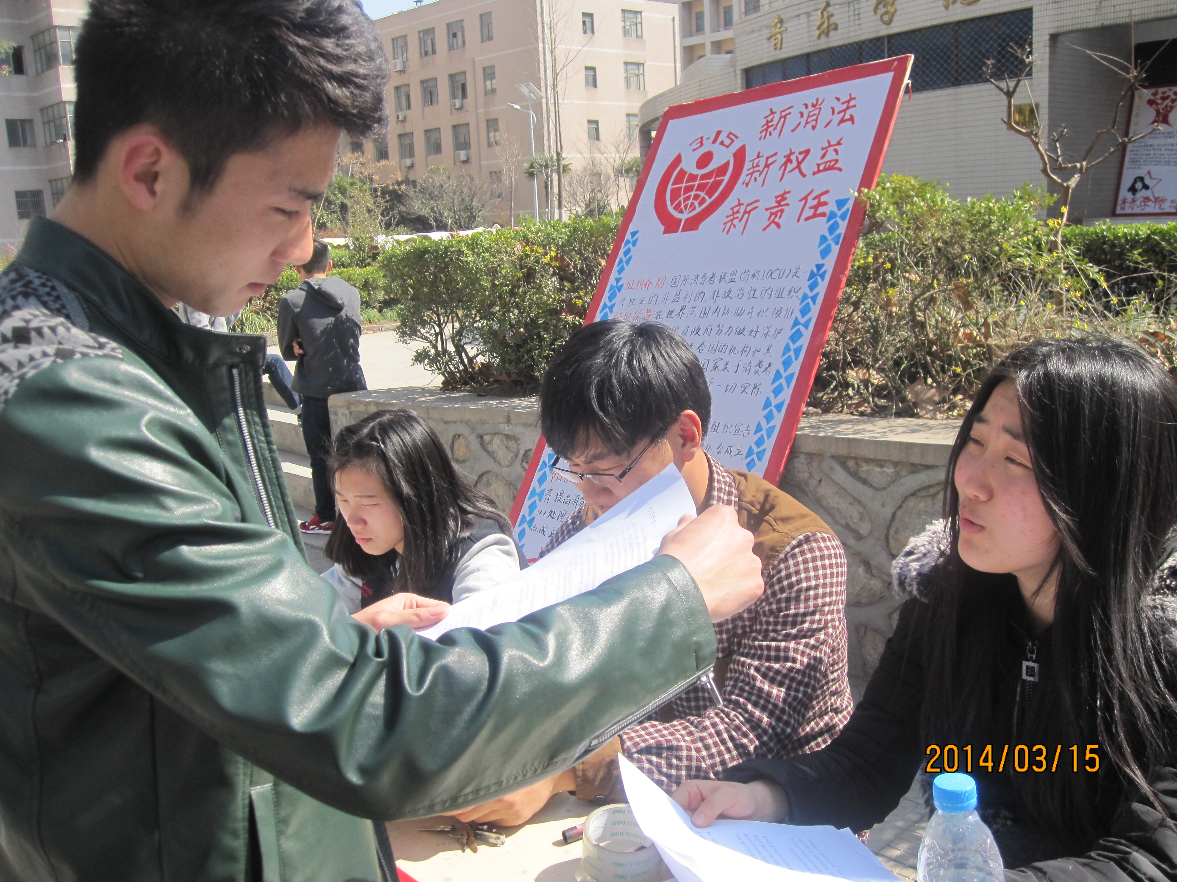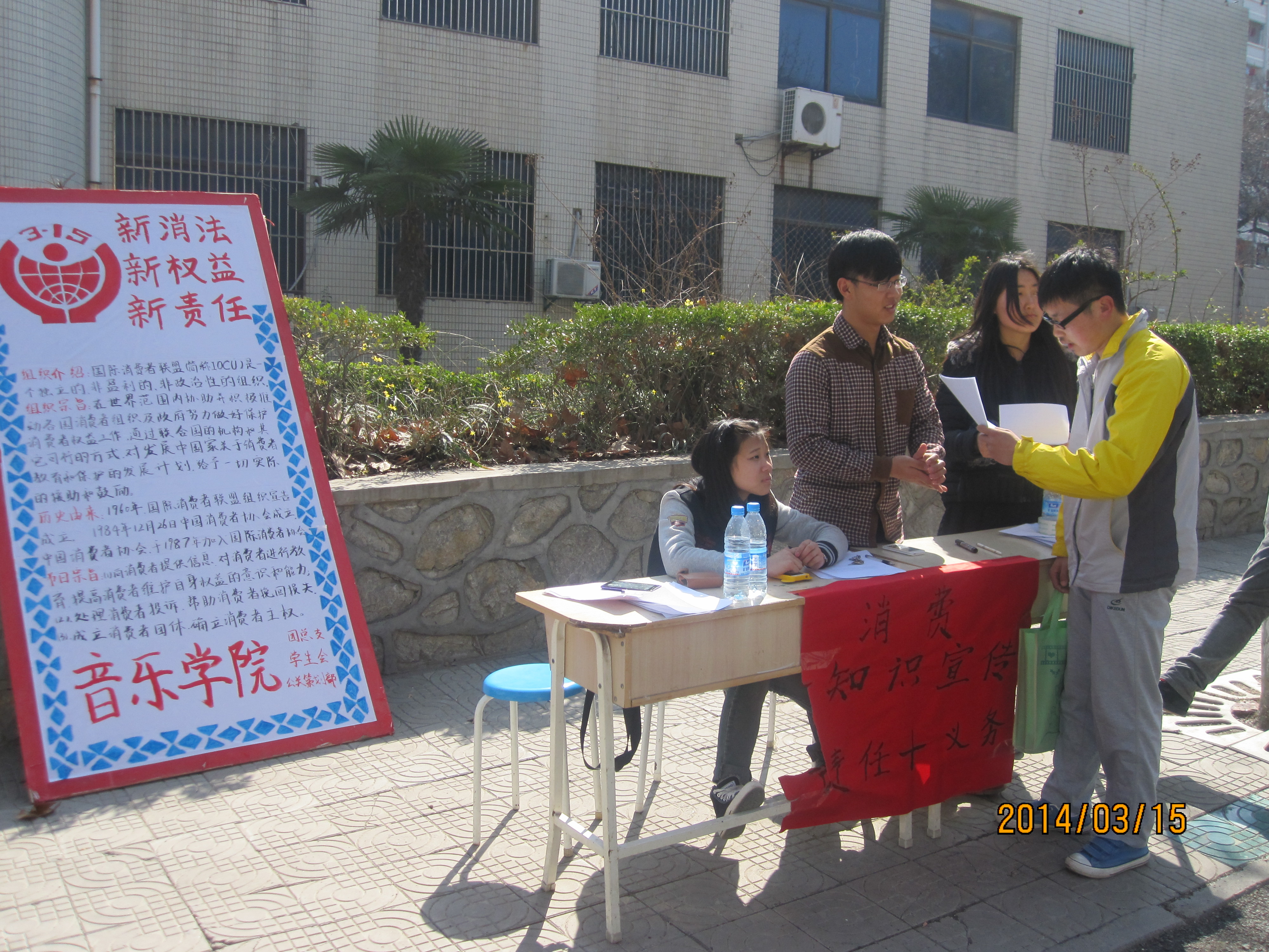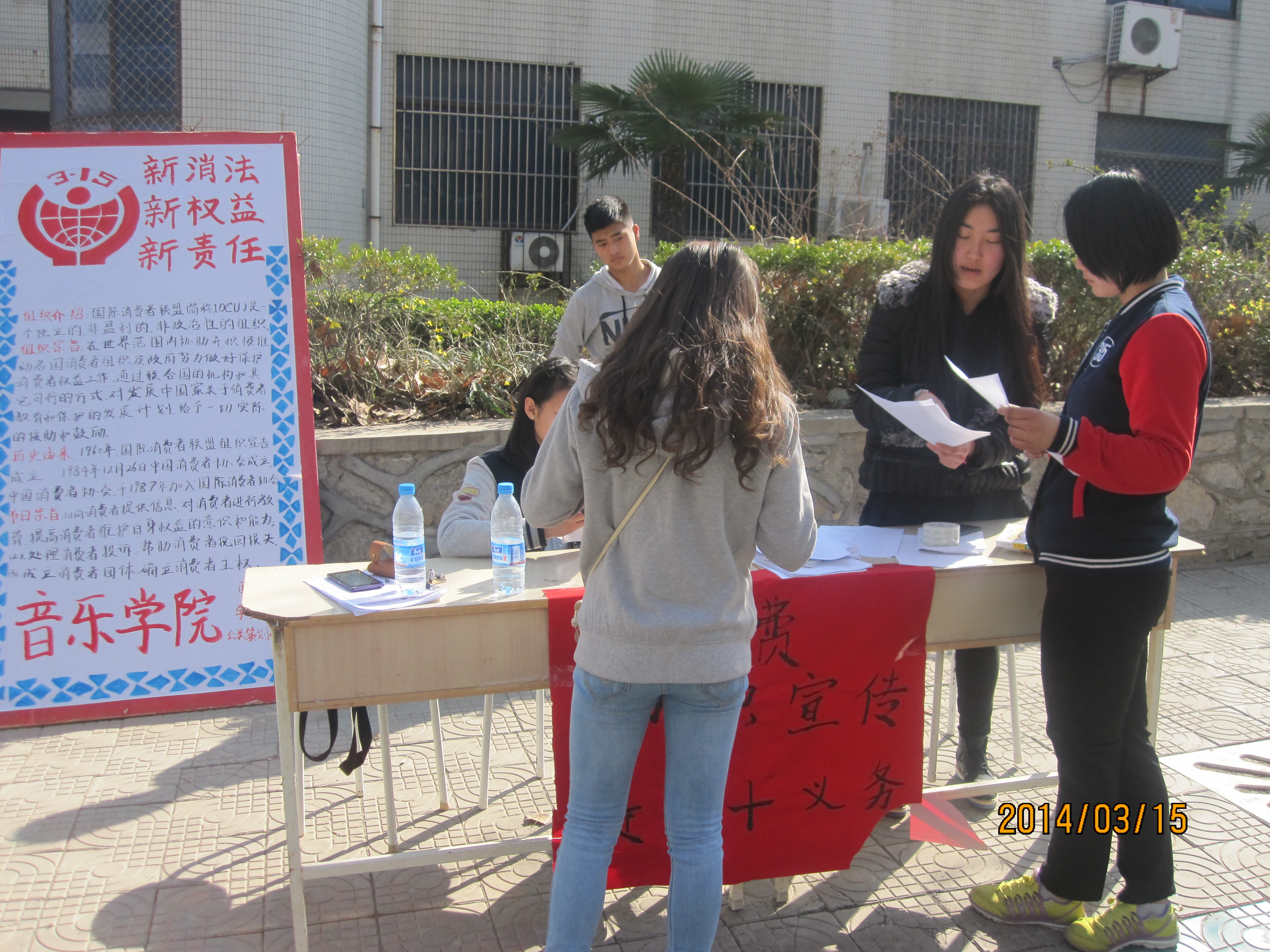 音乐学院在3月15日举行“新消法、新权益、新责任”主题宣传活动。3·15国际消费者权益保护日,更好的为消费者提供保障,营造一个公平、公正、诚信经营的消费环境。