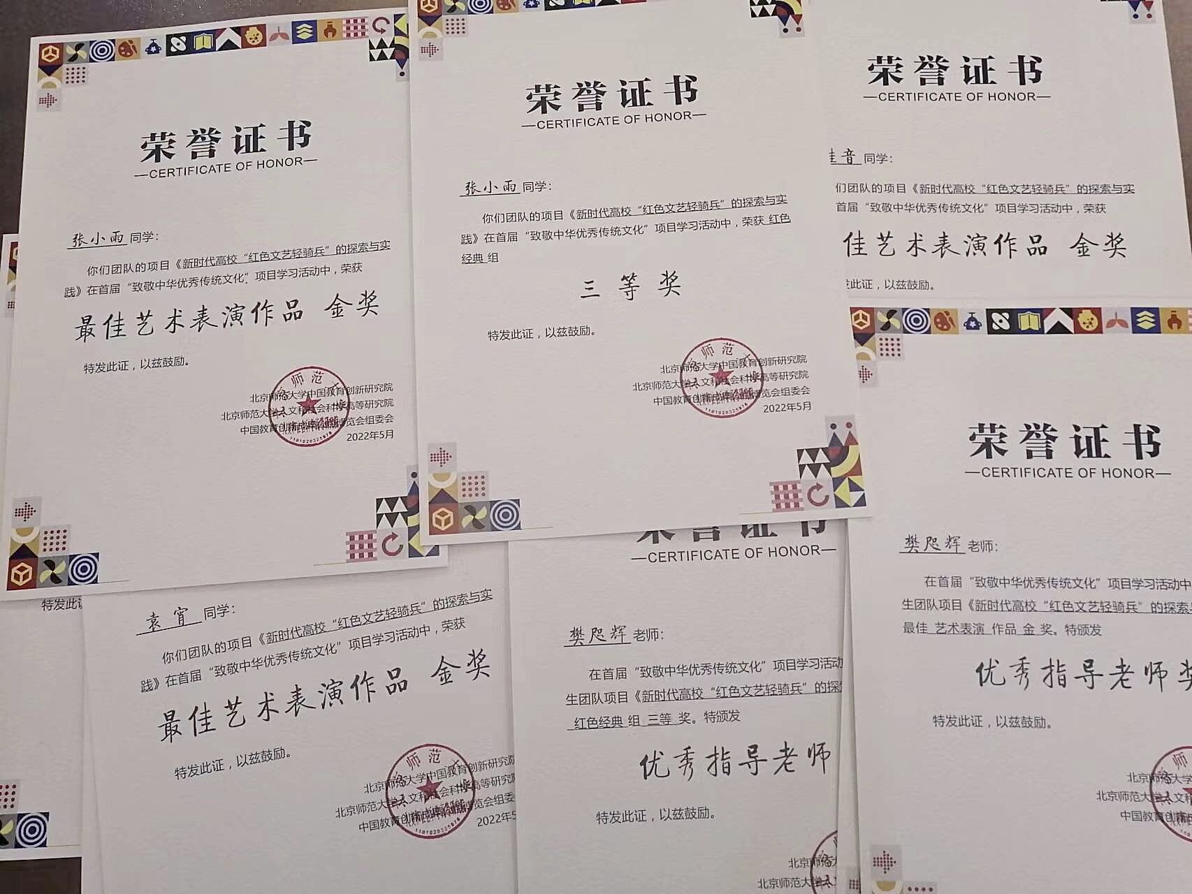 5月29日,由北京师范大学中国教育创新研究院、中国教育创新成果公益博览会组委会和中国网教育频道共同举办的第六届中国教育创新成果公益博览会——首届“致敬中华优秀传统文化”项目学习活动圆满完成。由我校创新创业学院和音乐学院联合报送的《新时代高校“红色文艺轻骑兵”的探索与实践》作品,获得了“最佳作品金奖”以及“红色经典组”三等奖的可喜成绩。